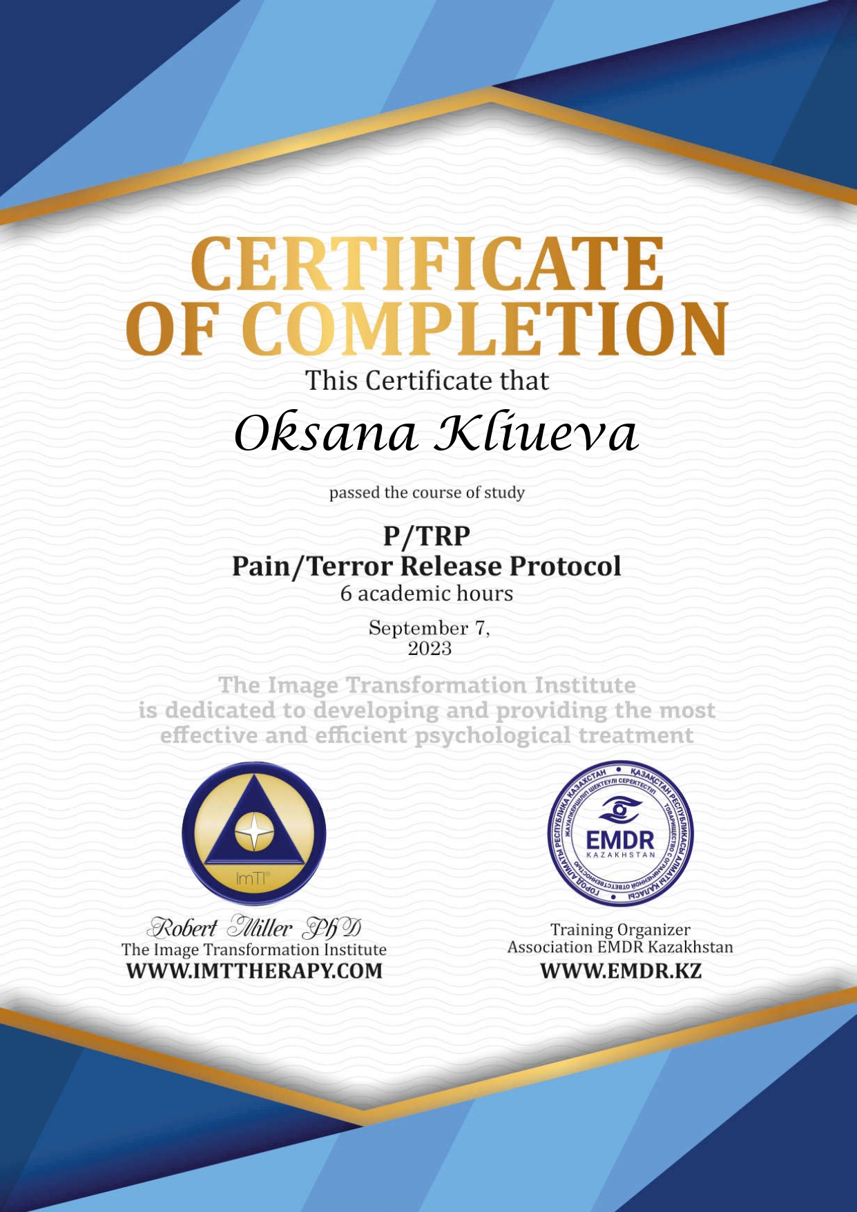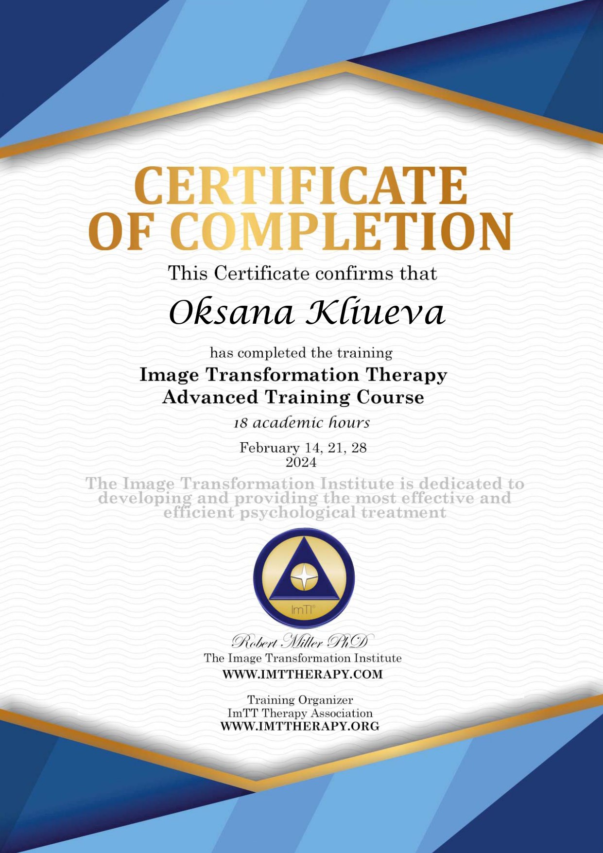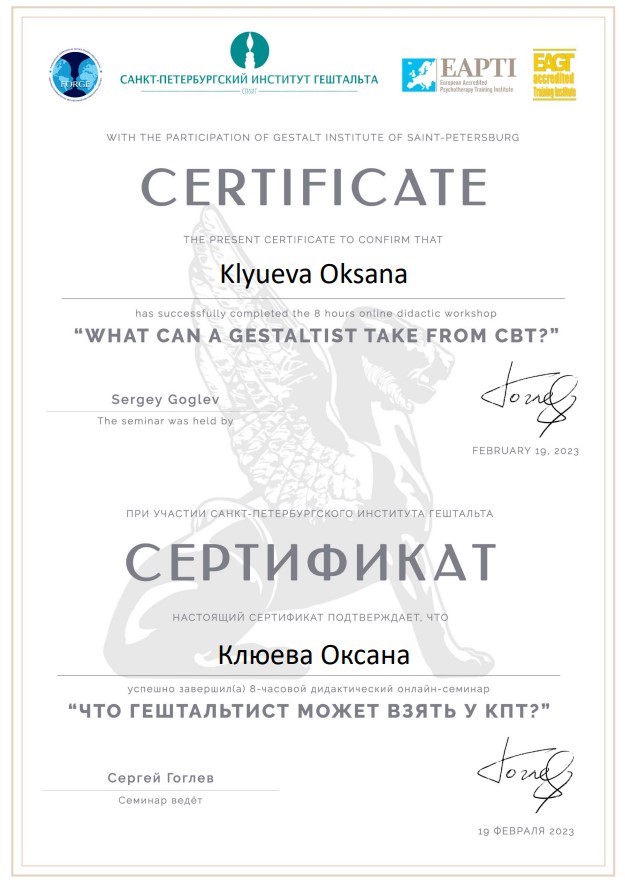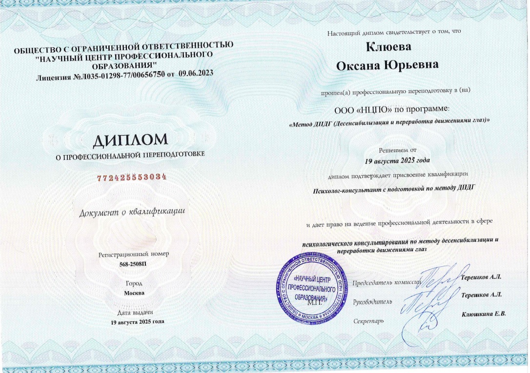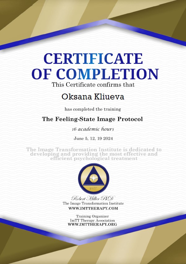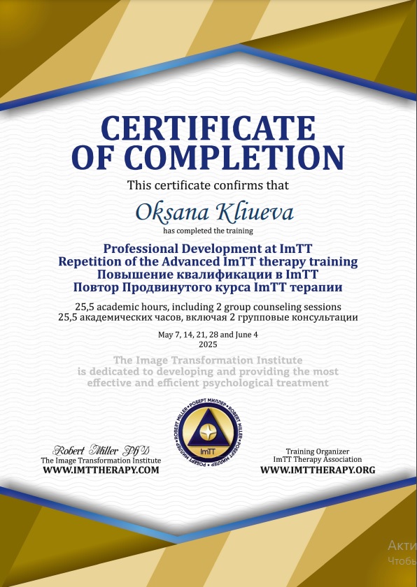 (EMDR и ImTT-терапевт, Гештальт-терапевт, Член международной ассоциации психологов)