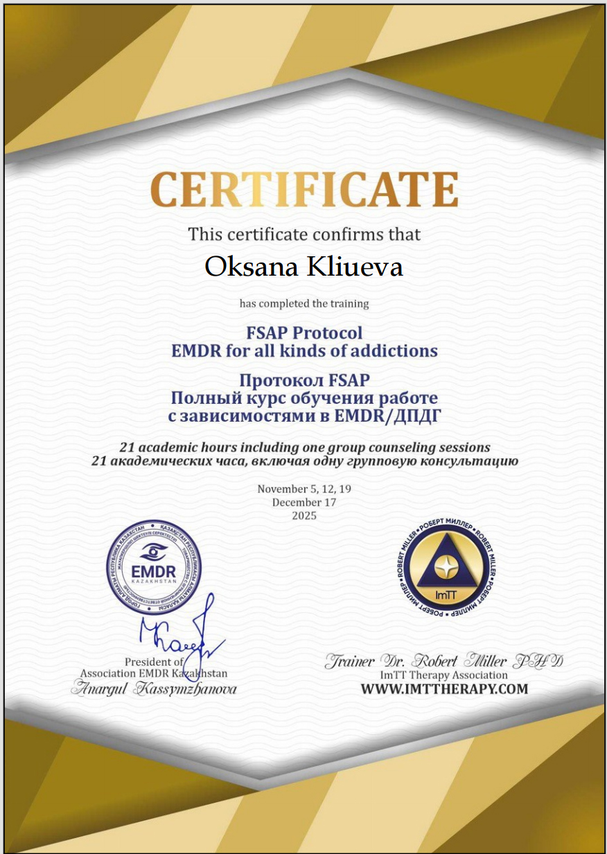 ❗Владею протоколами FSAP и FSIР для работы со всеми видами зависимого поведения через разрыв связи фиксированного чувства состояния от зависимости (или объекта зависимости) и поведения / вещества.